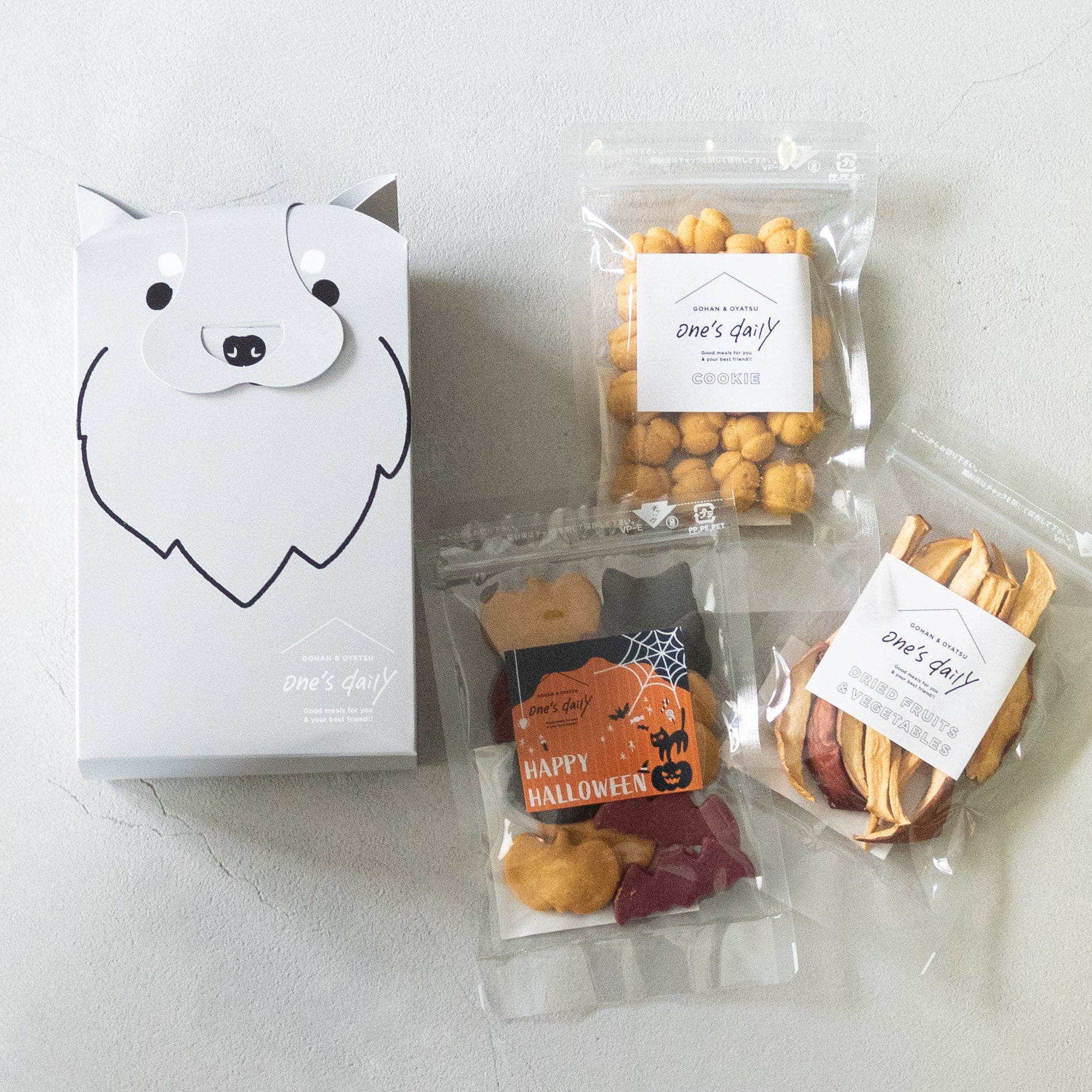 ワンコの形をした当店オリジナルのギフト箱とハロウィンをイメージしたかわいいおやつ3個のセットです。